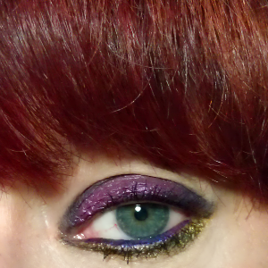 Next I lined the waterline with the same purple FOA gel, then panicked as it was way too pink for my old eyes - boo hoo, I looked like I'd been crying :-( Rather than removing it, I tried pressing some blue-purple gel from the Physician's Formula Shimmer Strips Liner (for green eyes) in the centre, and fortunately this had the effect of almost neutralising the pink.